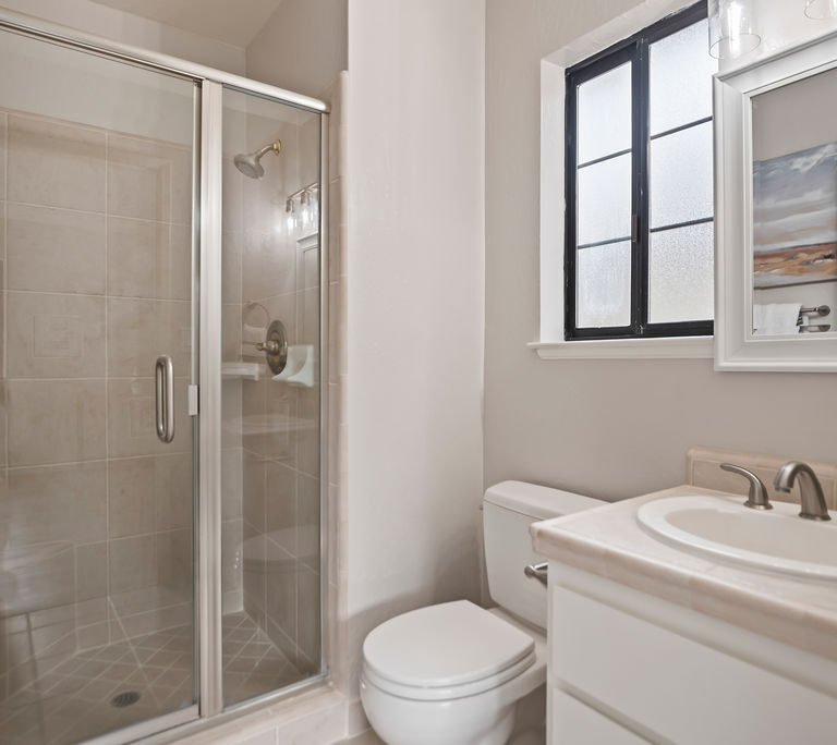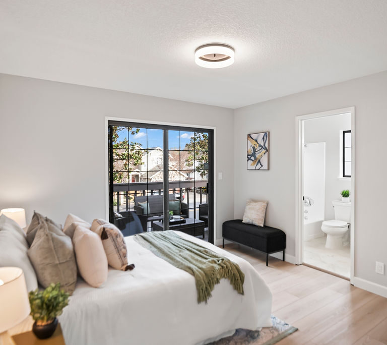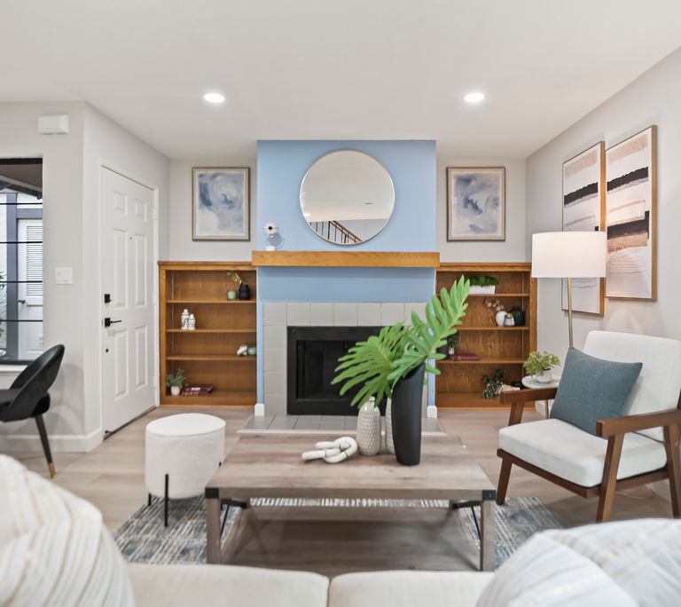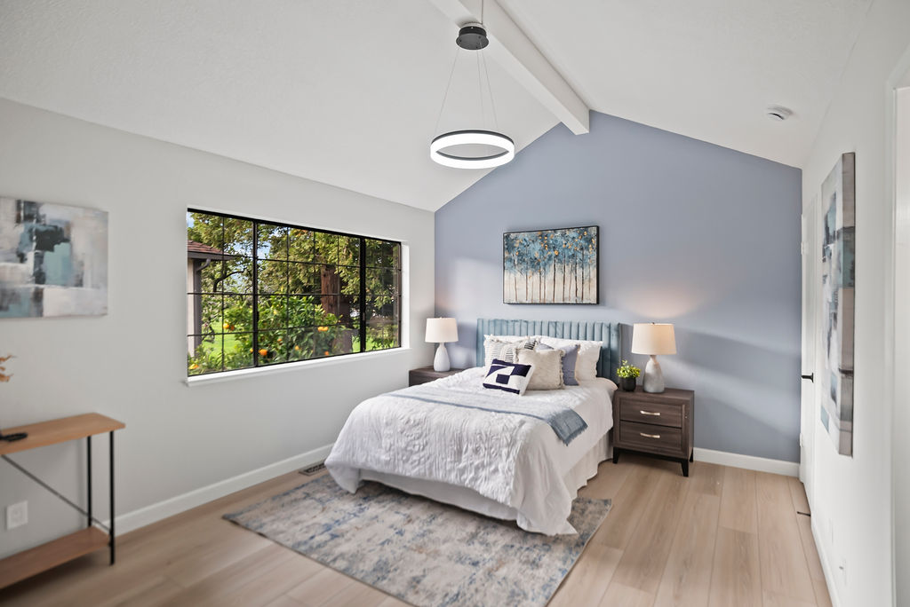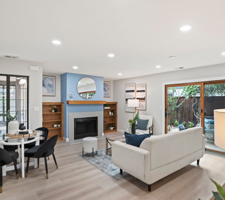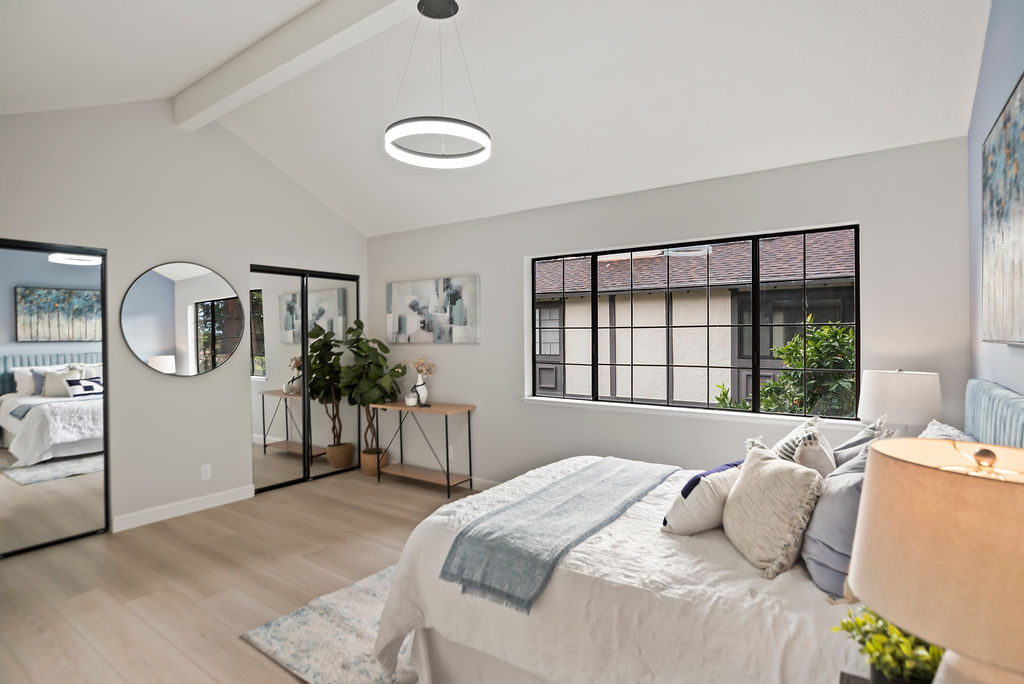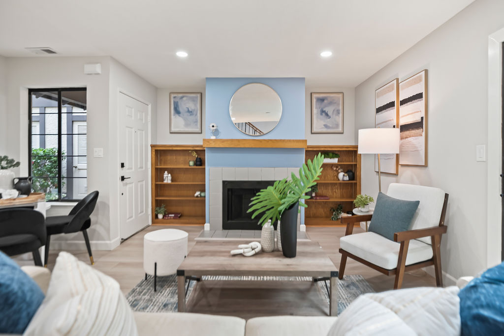 Both bedrooms are en-suite for ultimate privacy and convenience. One features soaring vaulted ceilings, while the other opens to a large balcony, ideal for morning coffee and enjoying the Bay Area’s beautiful year-round weather. The inviting living room, where recessed lighting and built-in bookshelves frame a cozy fireplace, is perfect for relaxing or entertaining.