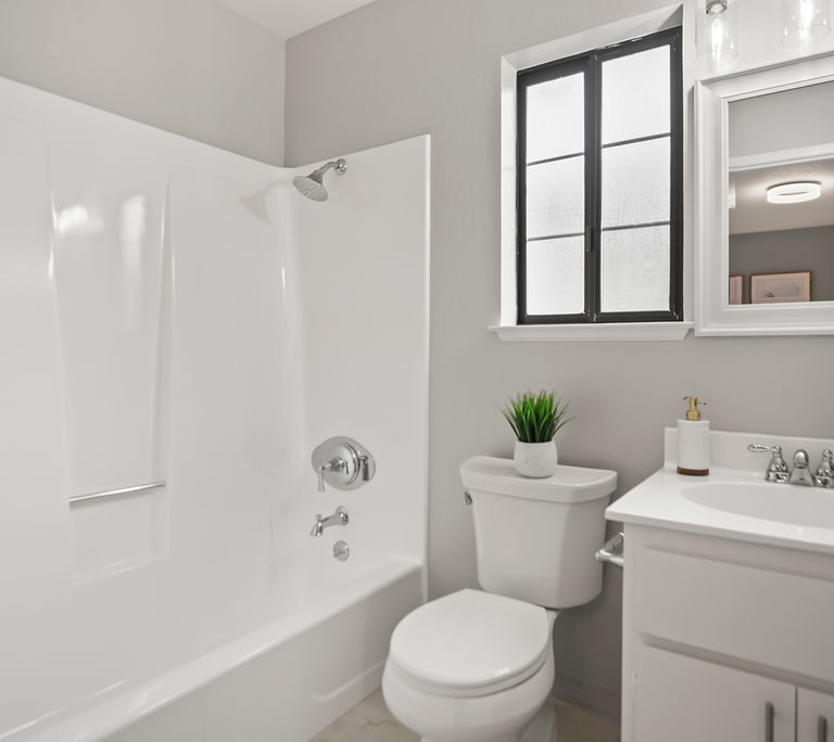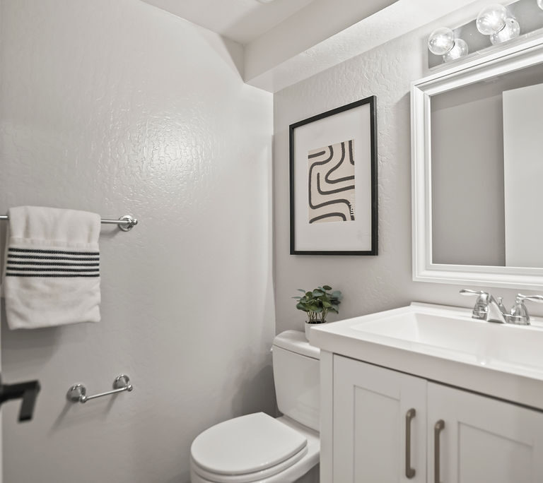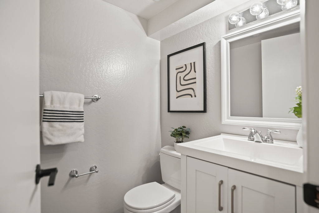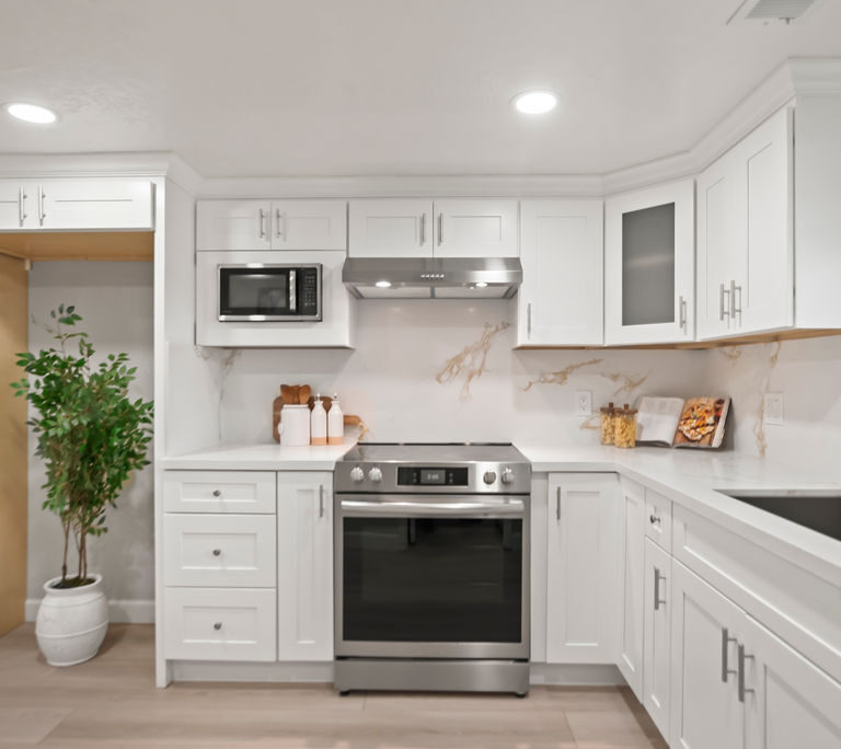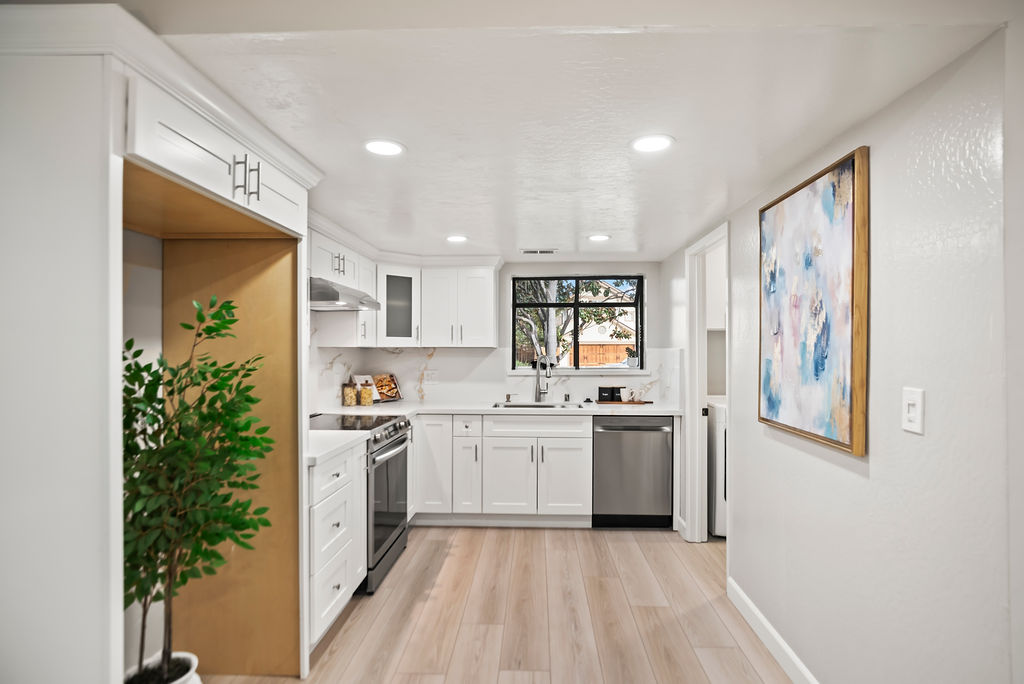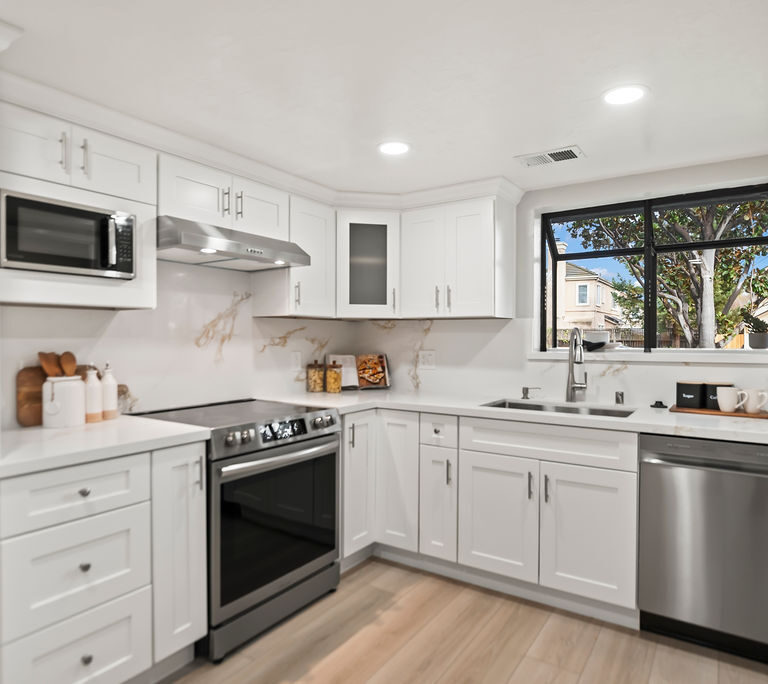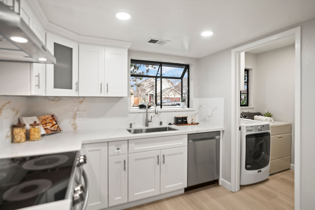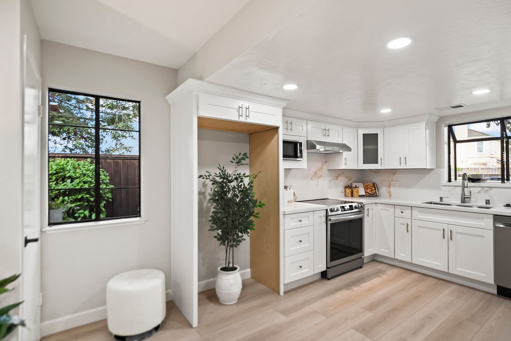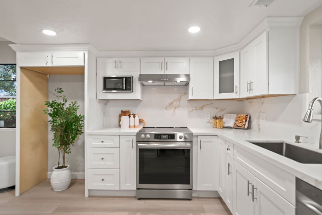 You’ll love the open kitchen with stainless steel appliances, elegant quartz countertops, and modern flair with black pulls on crisp white Shaker cabinets.